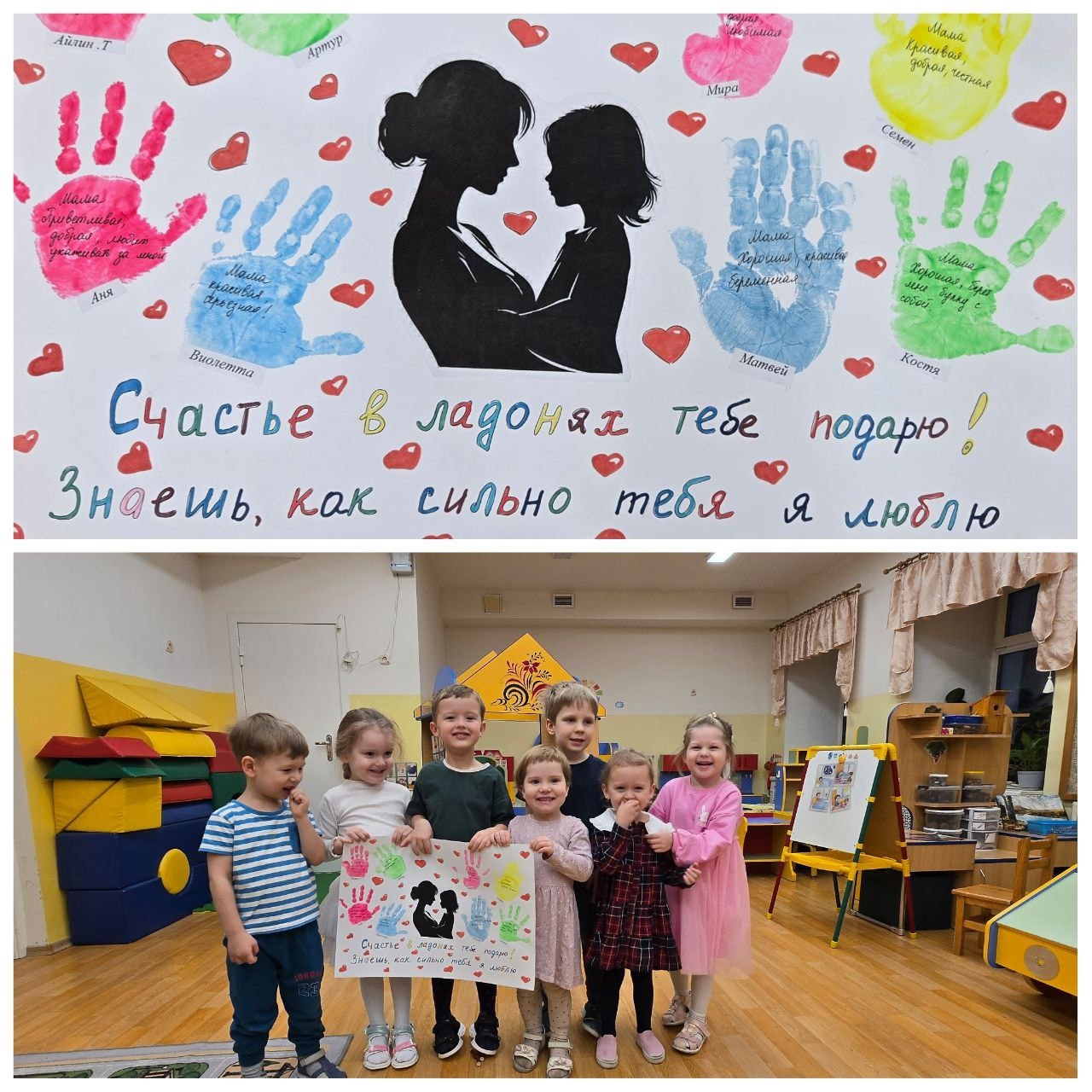 Малыши подарили мамам открытки с отпечатками своих ладошек с сердечком в центре. Пусть они напомнят о значении семейных традиций вместе со строчками Ксении Москалевой: